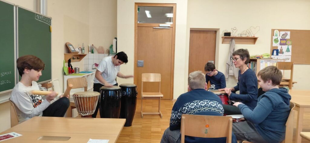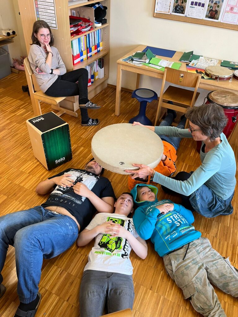 Einmal im Monat besucht uns die ausgebildete Musiktherapeutin Angelika an einem Mittwoch. Sie führt dann in allen Klassen etwa 30-minütige Musikeinheiten durch, in denen auf die individuellen Stärken und Fähigkeiten unserer Schüler:innen Rücksicht genommen wird. Dabei werden verschiedene Rhythmen ausprobiert, unterschiedliche Instrumente erprobt und viel gelacht.